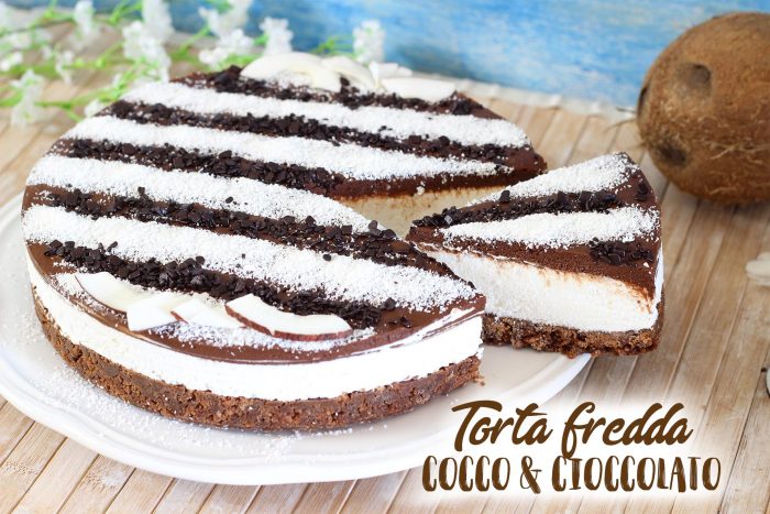Procedimento: Per prima cosa iniziamo tritando i biscotti al cacao in un frullatore. Se volete potete sbriciolare i biscotti anche in una bustina per alimenti con l’aiuto di un mattarello. Versiamo i biscotti in una ciotola e uniamo il burro fuso. Mescoliamo bene. Rivestiamo con cartaforno il fondo di una teglia (diametro 20cm), versiamo i biscotti all’interno e livelliamo bene la base con l’aiuto di un cucchiaio. Lasciamo riposare la base in freezer mentre prepariamo la farcitura. In una ciotola montiamo la panna, non occorre montarla a neve ferma. Uniamo anche il formaggio e continuiamo a montare il tutto. Aggiungiamo a questo punto la farina di cocco e mescoliamo con l’aiuto di un cucchiaio. In un pentolino sciogliamo l’agar agar in poca acqua, portiamo a bollore sul fuoco e uniamolo subito al composto di panna. Riprendiamo la base di biscotti dal freezer e uniamo la farcitura. Livelliamo bene la superficie con l’aiuto di un cucchiaio. Lasciamo riposare in freezer per un’ora. Nel frattempo, in una ciotola con la cioccolata fondente, uniamo la panna bollente. Lasciamo sciogliere la cioccolata e lasciamola raffreddare a temperatura ambiente. Versiamo la glassa al cioccolato sulla torta e lasciamola in freezer per un’altra ora. A questo punto decoriamo la torta. Posizioniamo 3 cannuccie alla volta, fino a formare 4-5 strisce. Decoriamo le strisce senza cannucce con la farina di cocco. Togliamo delicatamente le cannucce e decoriamo le strisce senza cocco con delle scaglie di cioccolata. La nostra torta è pronta, possiamo servirla subito o conservarla in frigo!